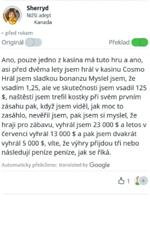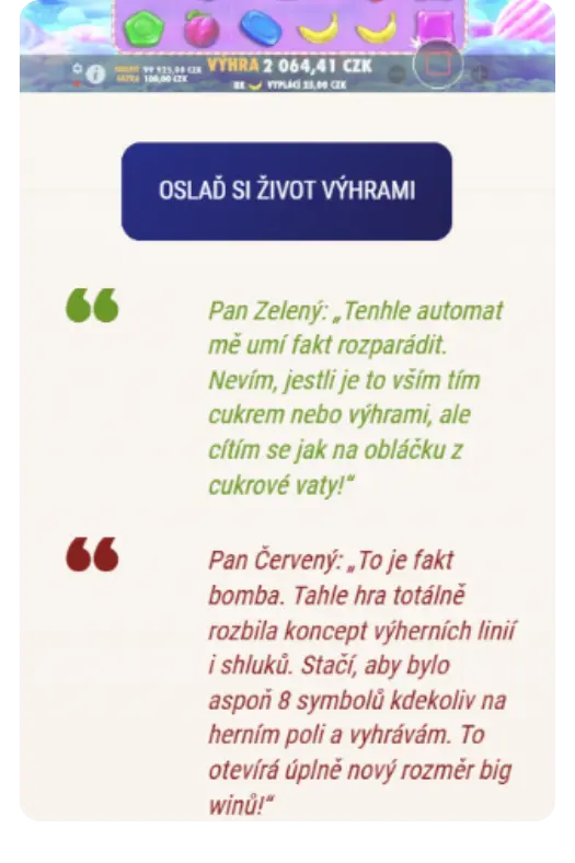 Já nabízím sladkou zábavu s výhrami až 21 175násobku sázky. Tento automat s 6×5 válci přináší RTP 96,51 %, což znamená průměrný návrat 965,10 CZK z každých 1000 CZK vsazených. Hráči v Česku oceňují volatilitu na úrovni 4/5, kde se střídají menší výhry s velkými jackpoty nad 500 000 CZK. Podle statistik dosáhlo 15 % hráčů maximálního multiplikátoru 100x během volných otoček.