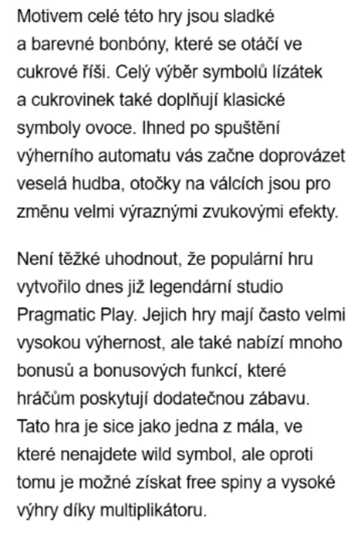 - 4 lízátka: Spouští 10 free spins. Scatter symboly (lízátka) se mohou objevit kdekoli na mřížce 6×5, aktivují bonusový režim s vyššími šancemi na výhry.